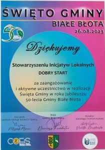 22 września w Centrum Kultury w Białych Błotach odbyło się wyjątkowe wydarzenie, na którym Wójt Gminy Białe Błota wyraził swoje serdeczne podziękowania dla Stowarzyszenia „Dobry Start” za nieocenione wsparcie i zaangażowanie w realizację prestiżowego przedsięwzięcia pod nazwą „Święto Gminy Białe Błota”.